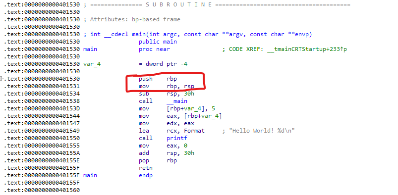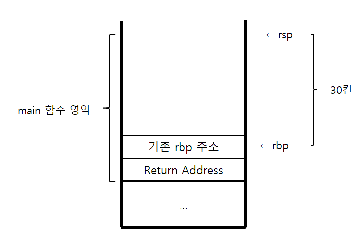 rbp는 아직 이전 함수가 차지하는 공간의 밑바닥 부분을 가리키고 있다 (정확히 맨 밑바닥은 아니다. 매개변수와 return address 때문에). main 함수의 호출 직후 실행되는 동안에 이전 함수에 있는 공간들은 빠져나갈 일이 없으므로 rbp는 변할 일이 없다. main 함수에서 스택을 제대로 활용하기 위해서는 저 rbp를 이전 함수가 아닌 main 함수쪽으로 이동시켜야 한다. 이 작업이 맨 처음 두 줄에서 이루어진다.