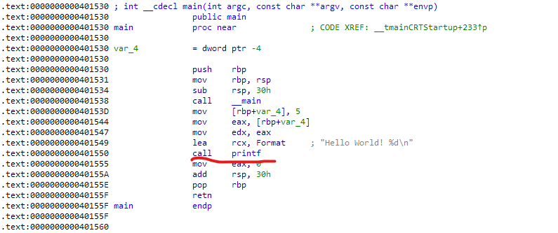 결국 printf는 5와 rcx에 들어있는 문자열 주소를 인자로 가져가서 화면에 출력하는 역할을 해준다. 이로써 main 함수에서의 모든 기능 실행이 완료되었다.