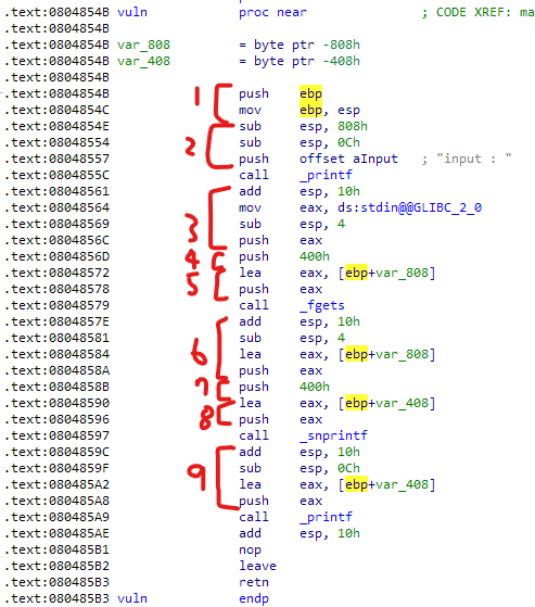 얼핏 보면 사용자로부터 fgets로 읽어 들인 문자열을 var_808에 저장한 뒤, 이 문자열을 var_408로 옮기고 printf로 옮긴 문자열을 출력하는 프로그램이다. 하지만, snprintf에는 취약점이 하나 존재한다.