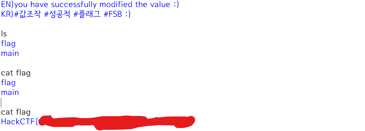 아래 코드를 실행함으로써 %n을 통해 134514100가 전달되어 printf함수의 위치가 담겨있는 주소 값에 flag함수의 위치가 들어가게 된다.