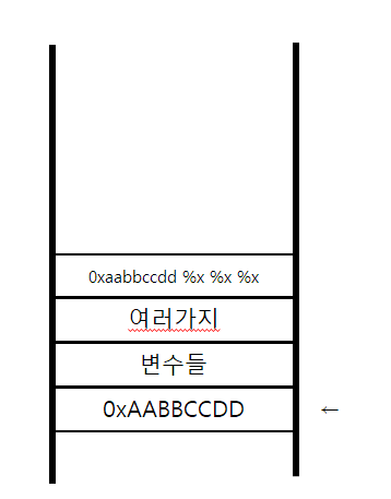 만약 포멧스트링의 맨 앞을 주소값을 저장한다면 스택의 밑부분에는 무조건 한번 저장했던 주소값이 한번 더 나타날 것이다. 만약 위의 그림처럼 3번째 위치에 주소값이 저장되어있다면, 세 번째 형식 지정자를 %n으로 해서 저 주소값에 원하는 값을 저장할 수도 있다.