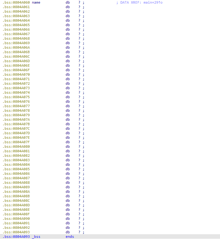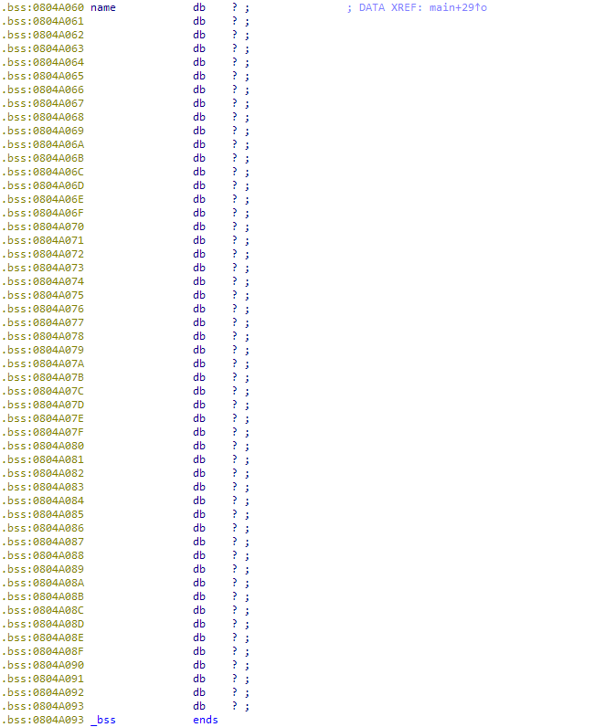 하지만 ASLR이 있다 해도(참고 : 1.3 변수와 메모리 모델 (aerocode.net)) 전역변수가 저장되는 영역은 위치가 변하지 않는다고 했다.(덕분에 프로그램 코드가 어디에 위치하는지에 대한 궁금증도 해결할 수 있었다.) 따라서 쉘코드를 전역변수인 name(위 사진을 보면 name이 위치한 곳이bss영역이라고 표시가 되어있었음)에다가 쓰고, return address를 name의 주소로 하면 될것 같았다.