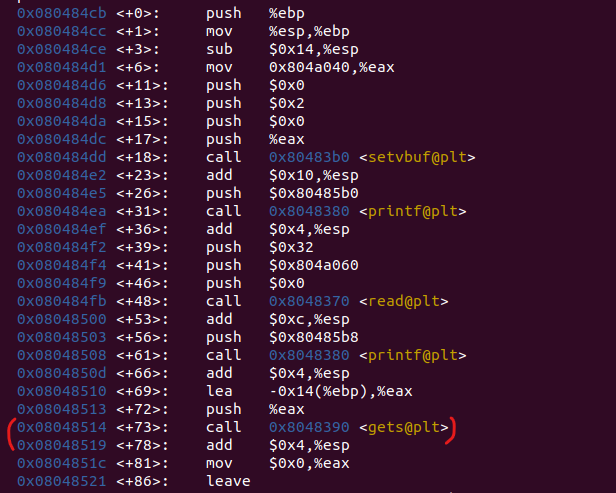 gets함수가 실행될때쯤 스택 모양이다. 현재 상황에서 함수의 흐름을 바꿀 수 있을만한곳은 +4 부분에 있는 return address이다.